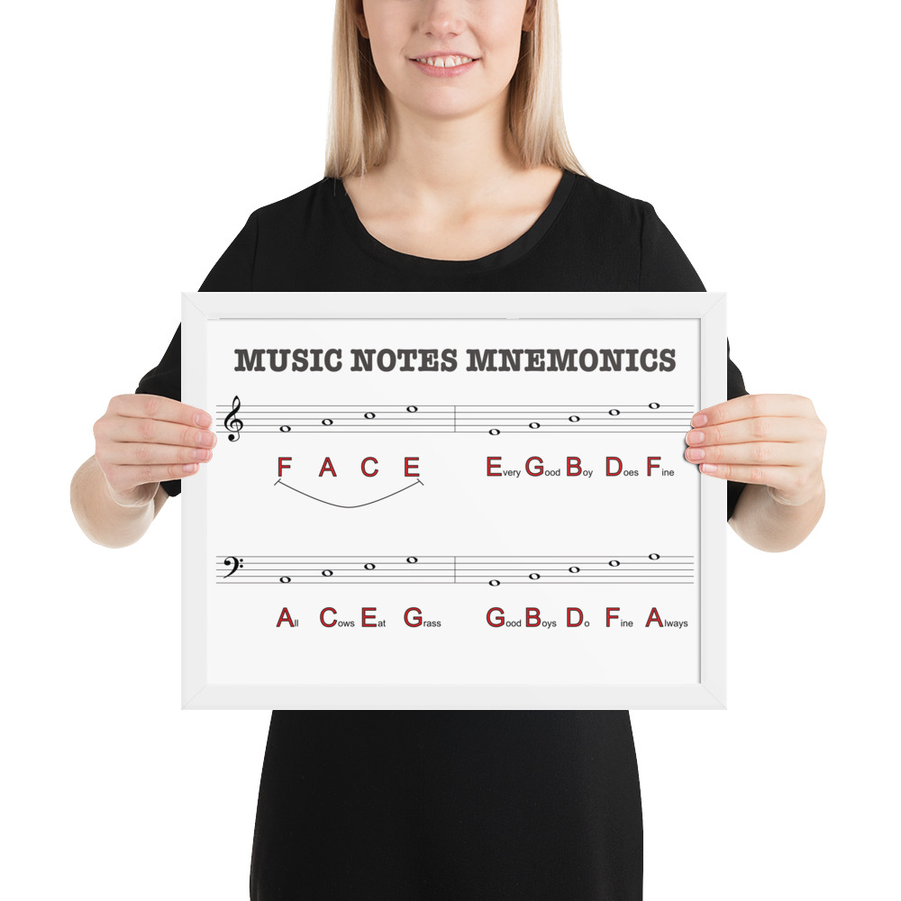 This is a framed poster of the notes on the treble and bass staffs with mnemonics to learn and memorise the line and space notes.